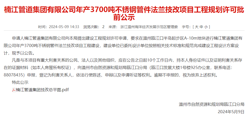 5月9日,溫州市自然資源和規(guī)劃局甌江口分局就楠江管道集團有限公司年產3700噸不銹鋼管件法蘭技改項目工程規(guī)劃許可進行批前公示,公示期:10個工作日。